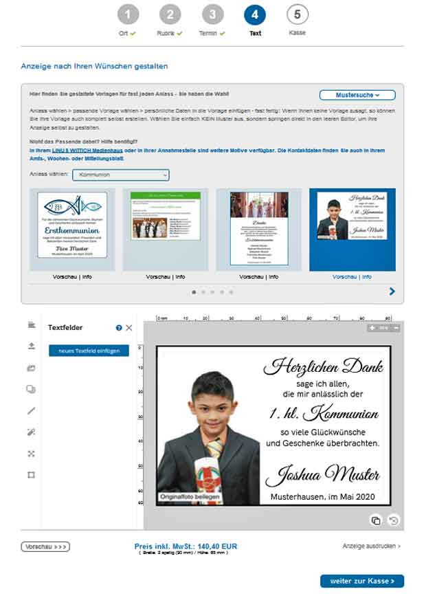 - Online mit unserem Anzeigensystem und vielen Mustervorlagen, hier für Kommunion und hier für Konfirmation