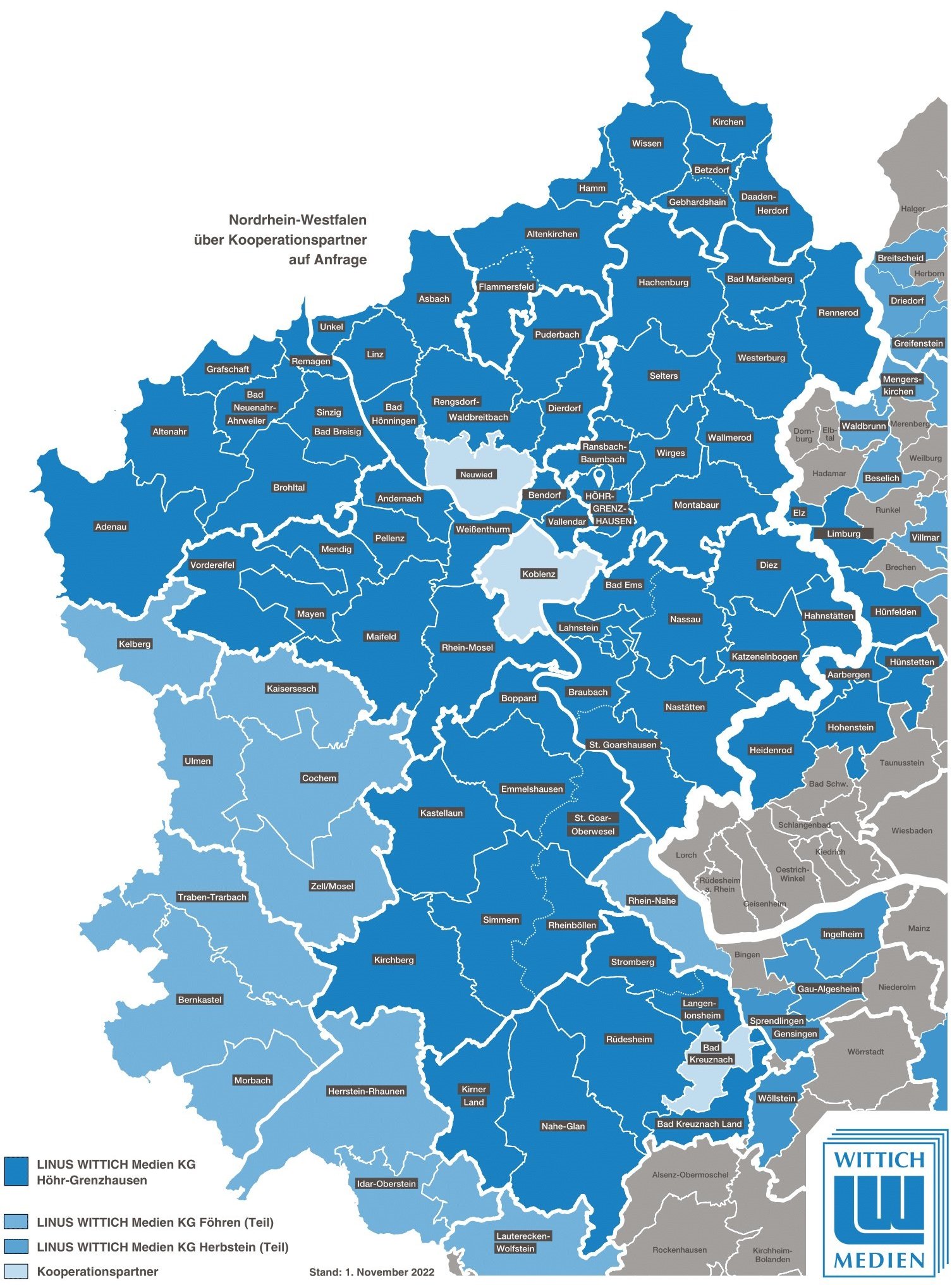 Das Verbreitungsgebiet unserer Amts- und Mitteilungsblätter umfasst die nachfolgend aufgeführten Kreise in Rheinland-Pfalz und in Teilen von Hessen. Die Reichweite Ihrer Anzeigenschaltung, egal ob Geschäftsanzeige, Familienanzeige oder Kleinanzeige, kann somit Ihren Anforderungen entsprechend, je nach gebuchten Ausgaben, individuell und kostengünstig angepasst werden.
