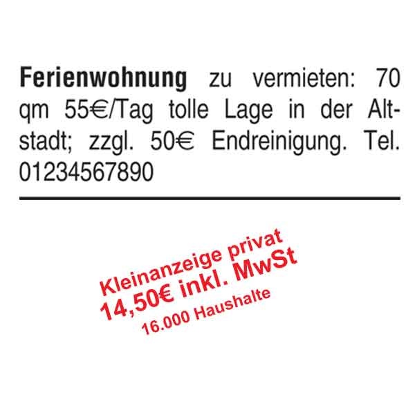 Wenn's günstig und doch auffallend sein soll, bieten sich Kleinanzeigen für Gelegenheiten mit wenig, aber informativem Text und Bild sowohl für Geschäftskunden, also auch Privatkunden an. Oftmals werden dise Kleinanzeigen in konkreten Rubriken thematisch zusammengefasst, z.B. KFZ, Immobilien uvm. Wir bieten, je nach Zeitungstitel, verschiedene Kleinnanzeigen-Typen an: