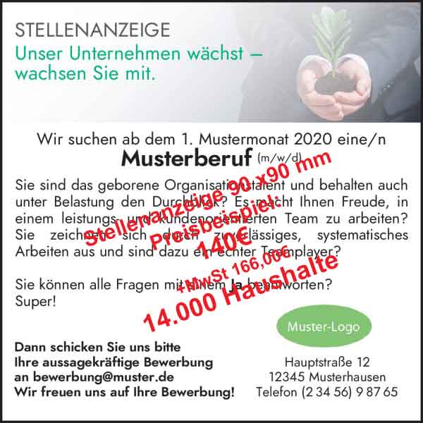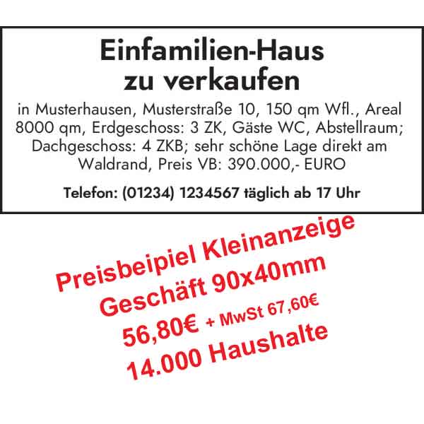 90x40mm 56,80 € + MwSt 67,60 €; 14.000 Haushalte