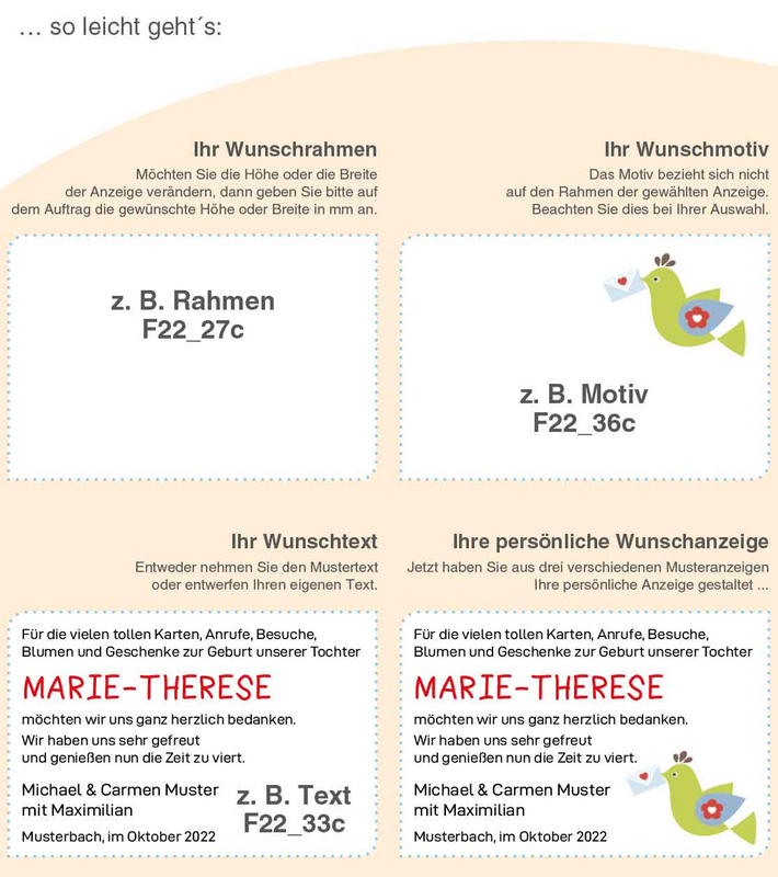 - Schritt: Wunschtext auswählen Wählen Sie einen beliebigen Wunschtext aus den Anzeigen-Mustervorlagen* oder den Textvorlagen* aus und ergänzen die Vorlagen durch Ihre individuellen Daten zur Geburt.