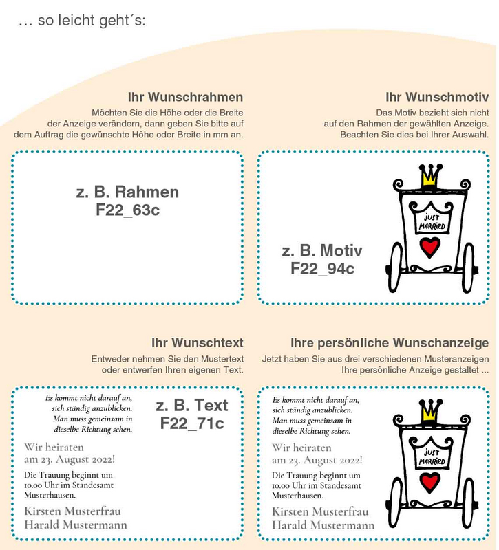 - Schritt: Wunschtext auswählen Wählen Sie einen beliebigen Wunschtext aus den Anzeigen-Mustervorlagen* oder den Textversvorlagen* aus und ergänzen die Vorlagen durch Ihre individuellen Daten zur Hochzeit