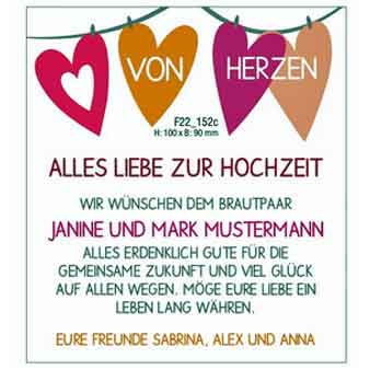 - Anschrift für Glückwünsche und/oder Tagesadresse der Hochzeitsfeier und/oder des Polterabends
