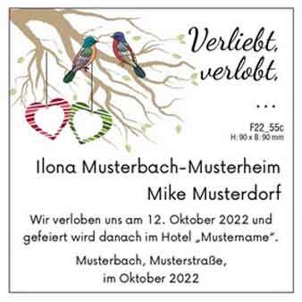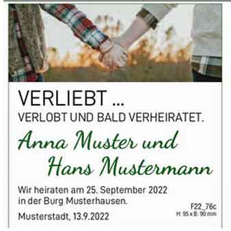Ihre Heiratszeitsanzeige als Verlobungsanzeige, Hochzeitsanzeige, Jubiläumsanzeige, Danksagung oder Grußanzeige können Sie mithilfe unserer Mustervorlagen für Gestaltung, Verse und Textvorschläge individuell