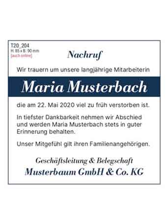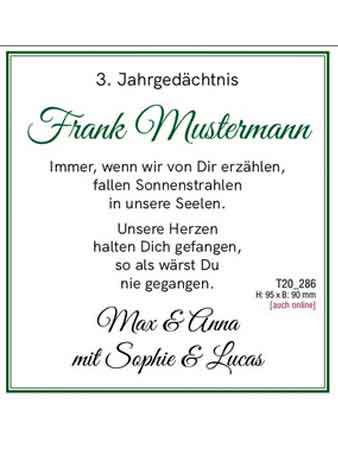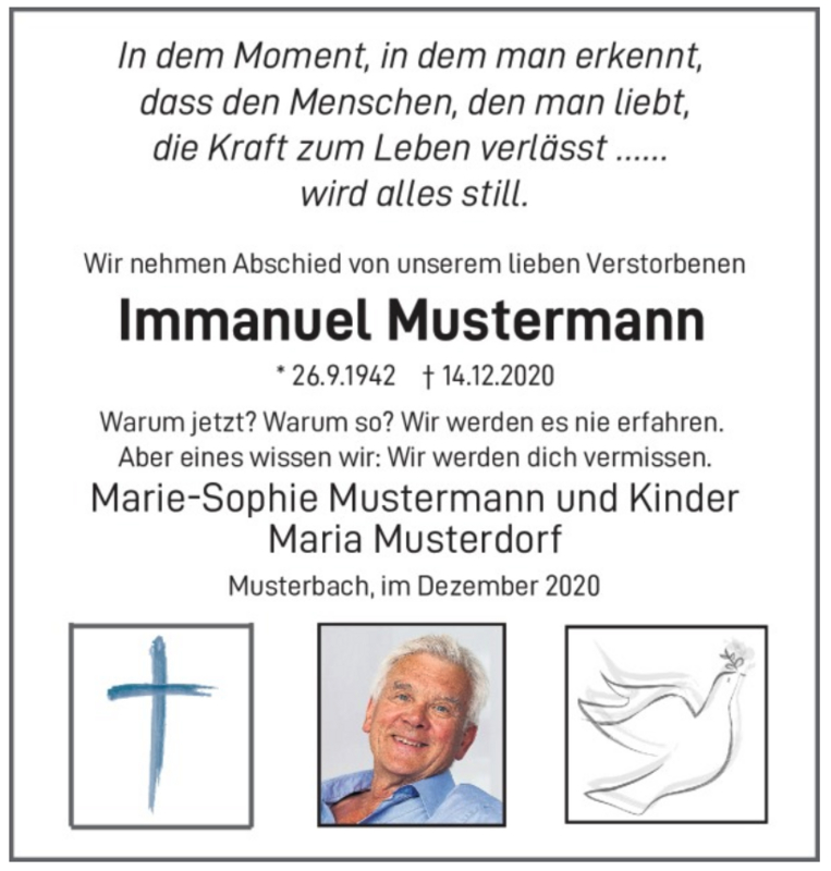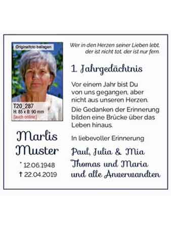- Schritt: Wunschtext auswählen Wählen Sie einen beliebigen Wunschtext aus den Anzeigen-Mustervorlagen* oder den Textversvorlagen* aus und ergänzen die Vorlagen durch Ihre individuellen Daten zu dem Verstorbenen.