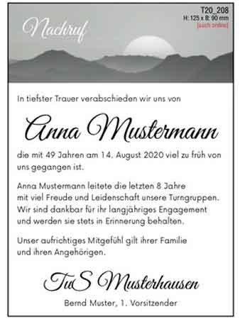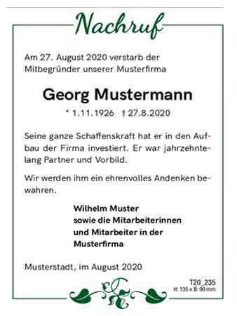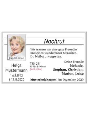 - mit einer Todesanzeige zeitnah über den Todeines Verstorbenen, Termine und Ort der Trauerfeier zu informieren, ihn würdigen und an ihn erinnern