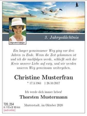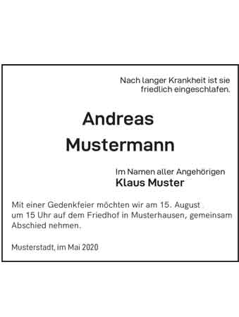 Ihre Traueranzeige als Todesanzeige, Nachruf, Danksagung oder Jahrgedächtnis können Sie mithilfe unserer Mustervorlagen für Gestaltung, Verse und Textvorschläge individuell