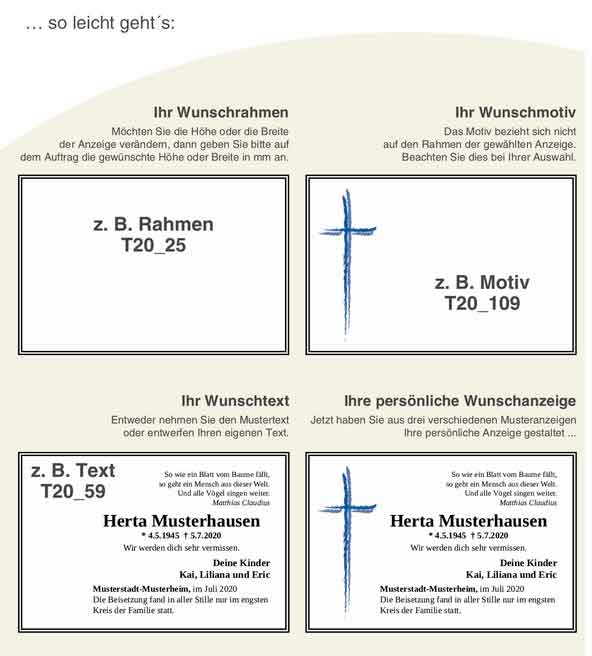 Nachstehend können Sie den Trauer-Muster-Katalog ansehen oder direkt ins Online-Anzeigensystem springen.