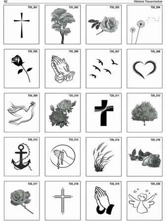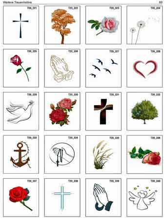 Nachfolgend eine kleine Musterauswahl aus unserem umfangreichen Trauerkatalog, den Sie downloaden können, um in Ruhe ein passendes Motiv zu finden: