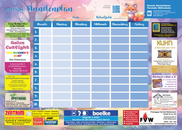 Wir bieten einen für die Leser*innen kostenfreien "Universalstundenplan" für das Schuljahr 2024/25 zur privaten Nutzung sowohl gedruckt als auch Online zum Download an.