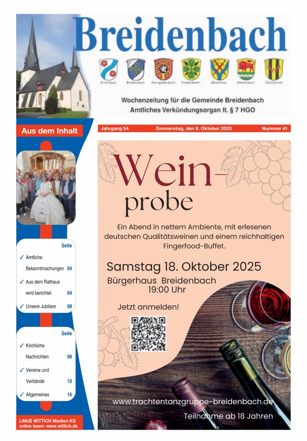 Wochenzeitung für die Gemeinde Breidenbach ist ein Mitteilungsblatt mit öffentlichen Bekanntmachungen der Kommunalverwaltung, das seit 1972 wöchentlich an alle erreichbaren privaten Haushalte und Unternehmen innerhalb des jeweiligen Verbreitungsgebietes von der LINUS WITTICH Medien KG Herbstein produziert und herausgegeben wird. Der Inhalt besteht überwiegend aus kommunalen Mitteilungen und deren öffentlichen Einrichtungen, kirchlichen Nachrichten, Veranstaltungsmitteilungen sowie Vereinsmeldungen.