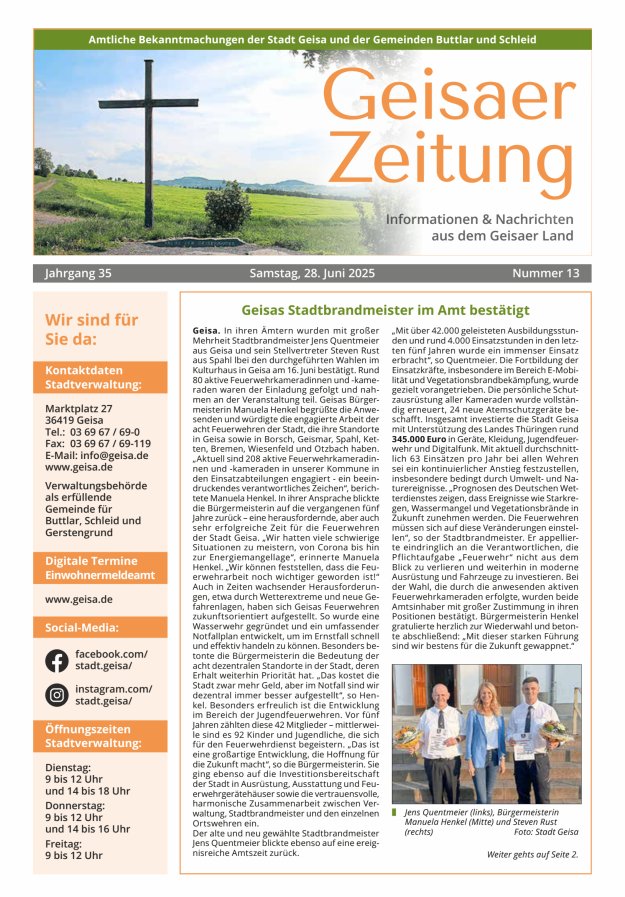 GEISAER ZEITUNG - mit Amtsblatt für Geisa, Buttlar und Schleid ist ein Mitteilungsblatt mit öffentlichen Bekanntmachungen der Kommunalverwaltung, das seit 1991 14tägig (gerade Wochen) erscheint und seit April 2022 von der LINUS WITTICH Medien KG Herbstein produziert und und im Abonnement herausgegeben wird. Der Inhalt besteht überwiegend aus kommunalen Mitteilungen und deren öffentlichen Einrichtungen, kirchlichen Nachrichten, Veranstaltungsmitteilungen sowie Vereinsmeldungen.