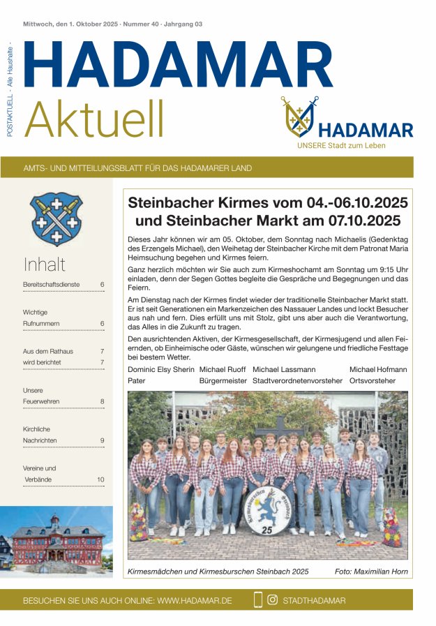 Alle erreichbar unter der Anschrift des Verlages. Innerhalb des Verbreitungsgebietes wird „Hadamar Aktuell“ kostenlos an jeden normal erreichbaren Haushalt zugestellt. Im Bedarfsfall Einzelstücke durch den Verlag zum Preis von € 3,50 (inkl. Porto und gesetzliche MwSt.).