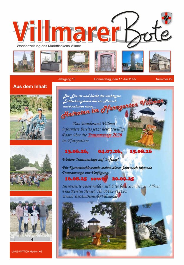 Die Heimat- und Bürgerzeitung mit den öffentlichen Bekanntmachungen erscheint wöchentlich. Herausgeber, Druck und Verlag: LINUS WITTICH Medien KG, 36358 Herbstein, Industriestraße 9-11, Telefon 06643/9627-0, Telefax Anzeigen 06643/9627-78. Internet-Adresse: www.wittich.de, E-Mail-Adresse: info@wittich-herbstein.de