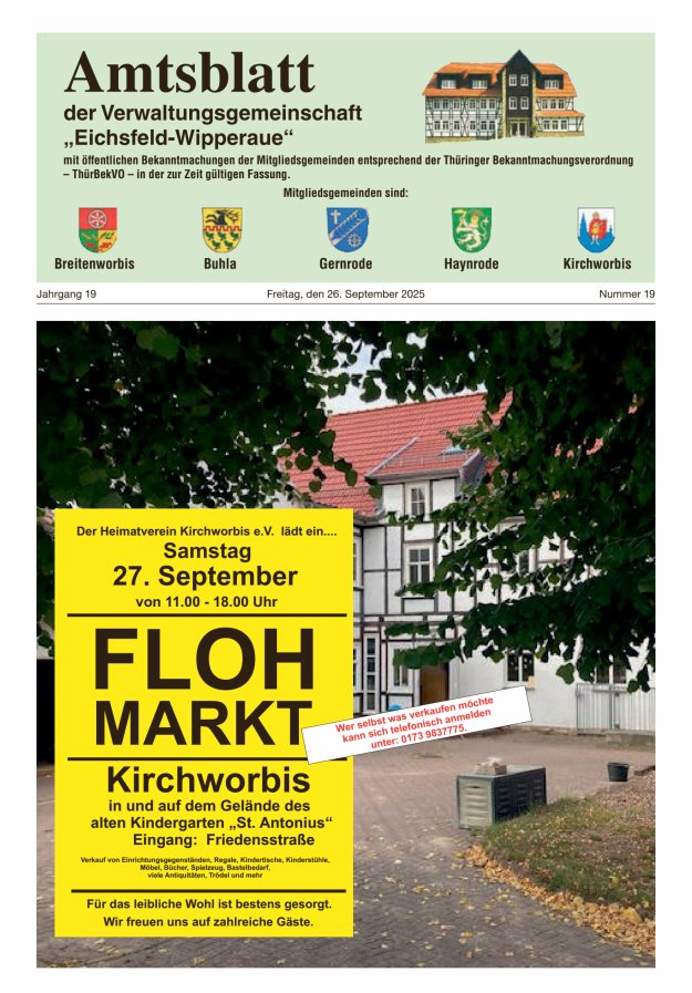 Herausgeber: Verwaltungsgemeinschaft „Eichsfeld-Wipperaue“, Sitz: 37339 Breitenworbis, Weststraße 2, Tel. 036074/770, Fax 036074/77200, E-Mail: poststelle@eichsfeld-wipperaue.