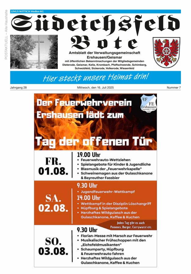 - Themen: Mitteilungen, Neuigkeiten aus den Kirchen und Vereinen, Verlagsmitteilungen sowie sonstige Mitteilungen, Angebote der Unternehmen