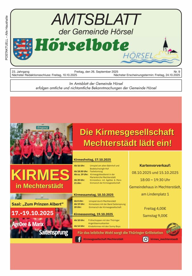 Das Amtsblatt Hörselbote ist das amtliche Bekanntmachungsorgan der entsprechenden Kommunalverwaltung und wird seit 2003 jeden Monat an alle erreichbaren privaten Haushalte und Unternehmen innerhalb des jeweiligen Verbreitungsgebietes von der LINUS WITTICH Medien KG Langewiesen produziert und von der Kommunalverwaltung herausgegeben. Der Inhalt besteht überwiegend aus Mitteilungen öffentlichen Einrichtungen, kirchlichen Nachrichten, Veranstaltungsmitteilungen sowie Vereinsmeldungen.