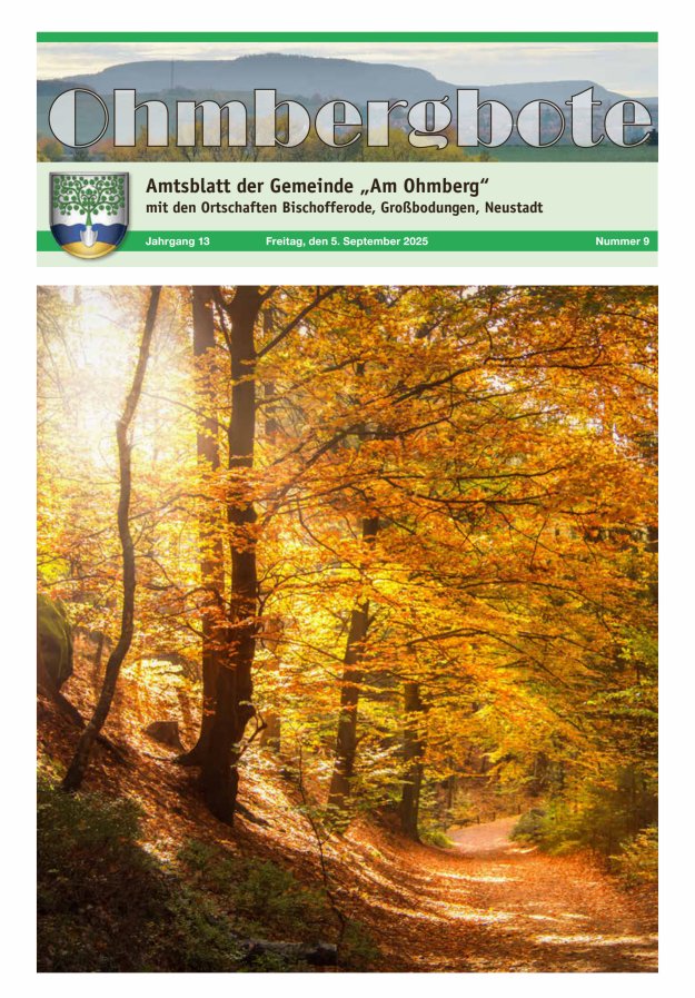 Herausgeber: Gemeinde Am Ohmberg, Großbodungen, Fleckenstraße 49, 37345 Am Ohmberg, Tel.: 036077/9390-0, Fax: 036077/9390-29, E-Mail: info@lg-am-ohmberg.de, Internet: