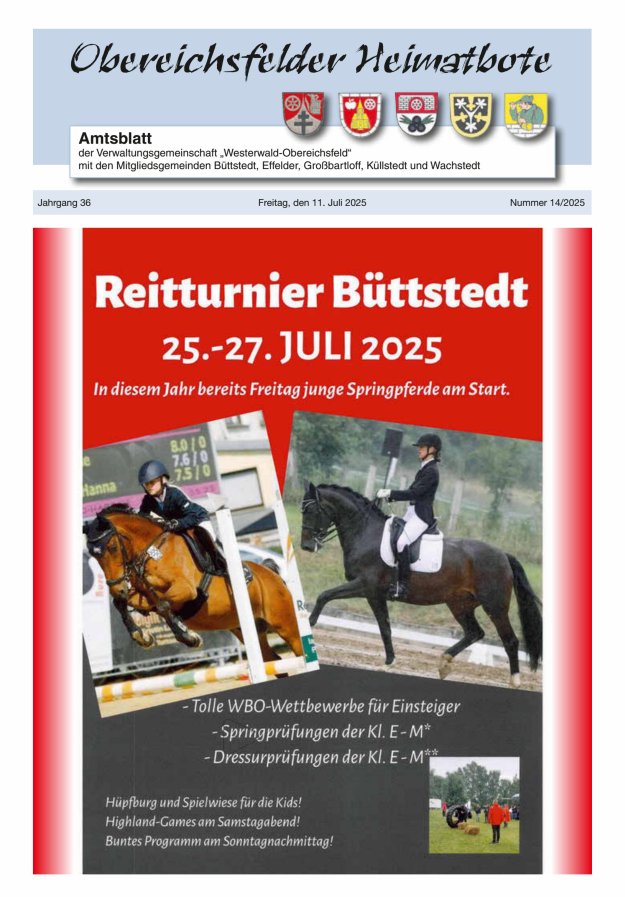 14-tägig, kostenlos an die Haushalte im Verwaltungsbereich. Im Bedarfsfall können Sie Einzelstücke zum Preis von 3,50 € (inkl. Porto und gesetzlicher MWSt.) beim Verlag bestellen. Hinweis: Für den Inhalt in diesem Blatt eventuell abgedruckter Wahlwerbung und/oder Anzeigen mit politischem Inhalt ist ausschließlich die jeweilige Partei/politische Gruppierung verantwortlich.