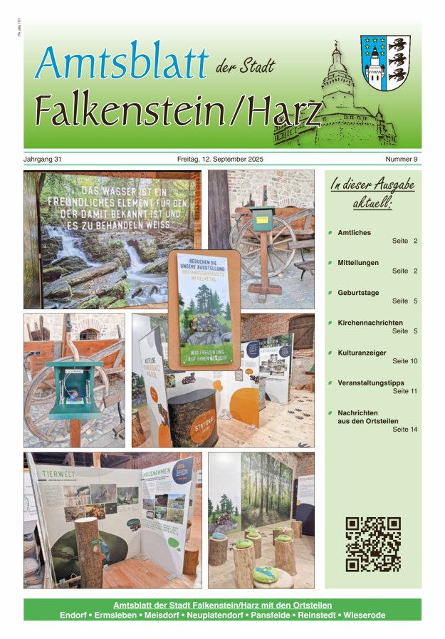 Der Kulturanzeiger der Stadt Falkenstein/Harz mit seinen Ortsteilen Endorf, Meisdorf, Neuplatendorf, Pansfelde, Reinstedt, Wieserode und der Stadt Ermsleben als Sitz der Verwaltung erscheint monatlich