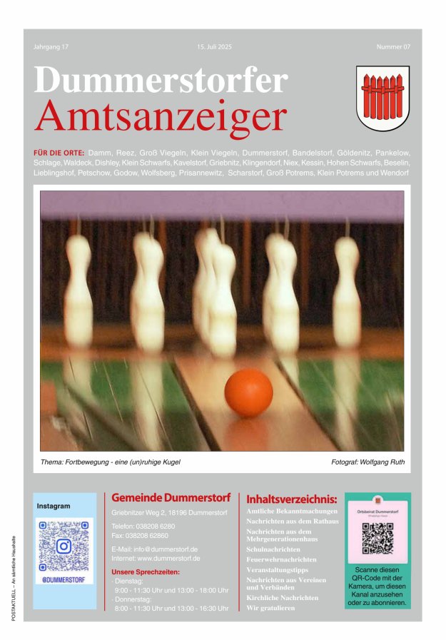 - Themen: Amtliche Bekanntmachungen, Amtliche Mitteilungen, Rathaus, Bürgermeister, Gemeinde, Nachrichten, Schule, Kita, Kindergarten, Verein, Verband, Feuerwehr, Kirche, Veranstaltungen, Geburtstage, Sprechzeiten Amtsverwaltung, Kontakte Amtsverwaltung, Kultur und Freizeit, Sport, Senioren, Damm, Reez, Groß Viegeln, Klein Viegeln, Dummerstorf, Bandelstorf, Göldenitz, Pankelow, Schlage, Waldeck, Dishley, Klein Schwarfs, Kavelstorf, Griebnitz, Klingendorf, Niex, Kessin, Hohen Schwarfs, Beselin, Lieblingshof, Petschow, Godow, Wolfsberg, Prisannewitz, Scharstorf, Groß Potrems, Klein Potrems, Wendorf