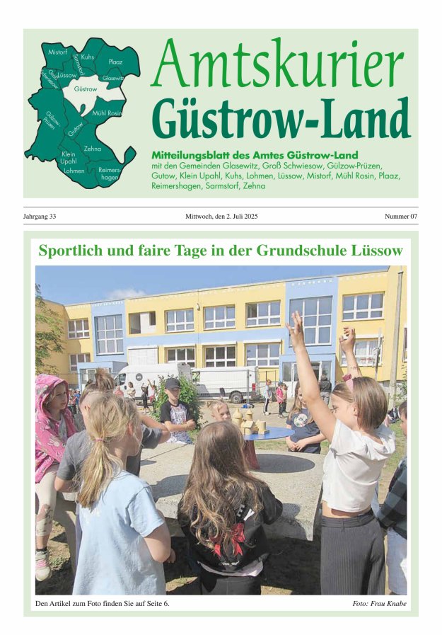 - Themen: Amtliche Bekanntmachungen, Amtliche Mitteilungen, Rathaus, Bürgermeister, Gemeinde, Nachrichten, Schule, Kita, Kindergarten, Verein, Verband, Feuerwehr, Kirche, Veranstaltungen, Geburtstage, Sprechzeiten Amtsverwaltung, Kontakte Amtsverwaltung, Kultur und Freizeit, Sport, Senioren, Amt Güstrow-Land, Glasewitz, Groß Schwiesow, Gülzow-Prüzen, Gutow, Klein Upahl, Kuhs, Lohmen, Lüssow, Mistorf, Mühl Rosin, Plaaz, Reimershagen, Sarmstorf, Zehna