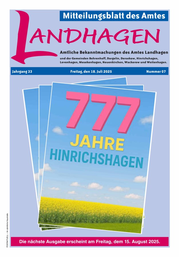 Mitteilungsblatt des Amtes Landhagen mit öffentlichen Bekanntmachungen der Amtsverwaltung