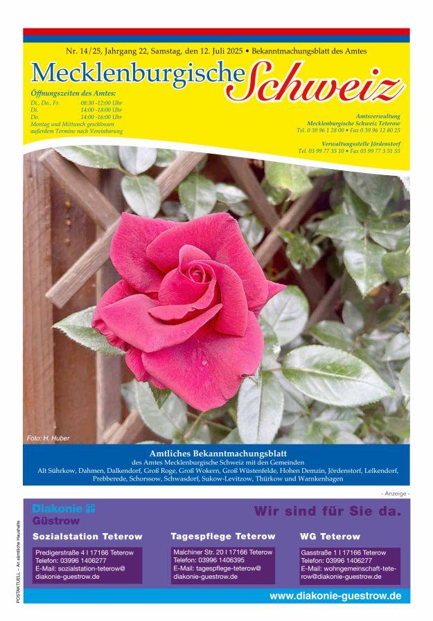 - Themen: Amtliche Bekanntmachungen, Amtliche Mitteilungen, Rathaus, Bürgermeister, Gemeinde, Nachrichten, Schule, Kita, Kindergarten, Verein, Verband, Feuerwehr, Kirche, Veranstaltungen, Geburtstage, Sprechzeiten Amtsverwaltung, Kontakte Amtsverwaltung, Kultur und Freizeit, Sport, Senioren, Mecklenburgische Schweiz, Alt Sührkow, Dahmen, Dalkendorf, Groß Roge, Groß Wokern, Groß Wüstenfelde, Hohen Demzin, Jördenstorf, Lelkendorf, Prebberede, Schorssow, Schwasdorf, Sukow-Levitzow, Thürkow, Warnkenhagen