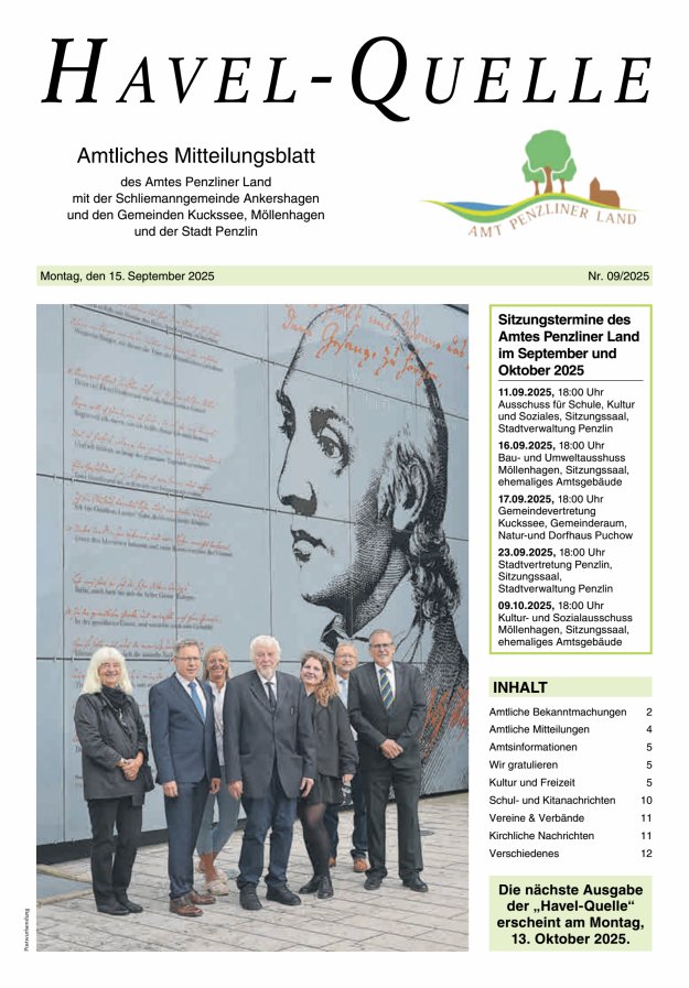 - Themen: Amtliche Bekanntmachungen, Amtliche Mitteilungen, Rathaus, Bürgermeister, Gemeinde, Nachrichten, Schule, Kita, Kindergarten, Verein, Verband, Feuerwehr, Kirche, Veranstaltungen, Geburtstage, Sprechzeiten Amtsverwaltung, Kontakte Amtsverwaltung, Kultur und Freizeit, Sport, Senioren, Schliemanngemeinde Ankershagen, Kuckssee, Möllenhagen, Penzlin