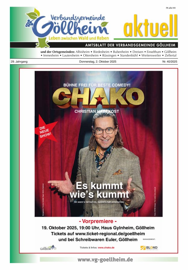 Herausgeber, Verlag und Druck: LINUS WITTICH Medien KG, Europaallee 2, 54343 Föhren, Internet: www.wittich.de • e-Mail Anzeigen: anzeigen@wittich-foehren.de • e-Mail Redaktion: goellheim@wittich-foehren.de