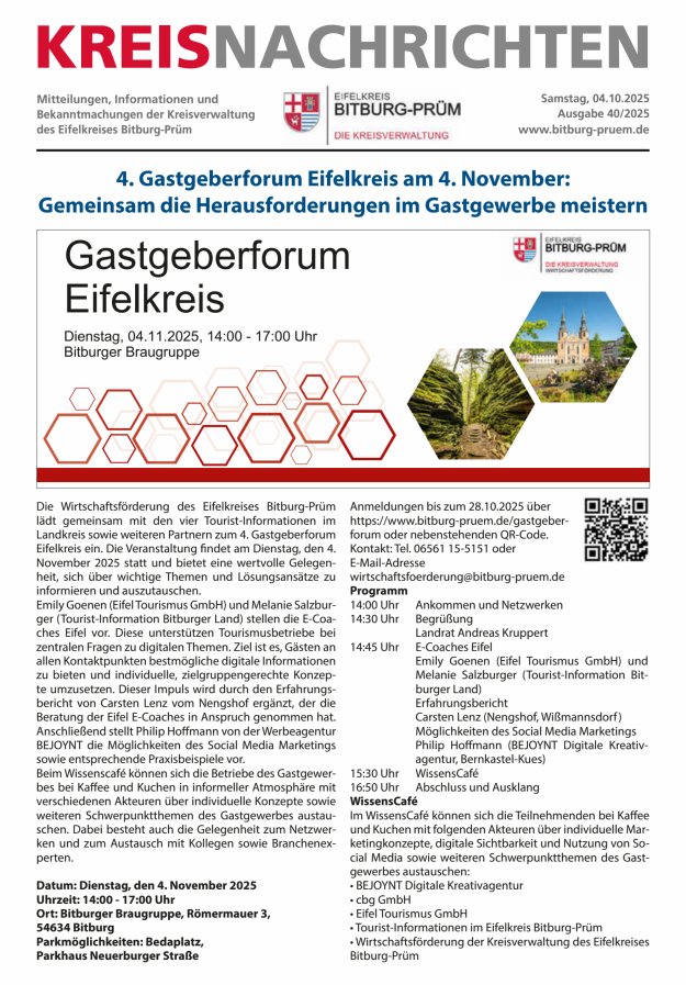 Redaktion und amtliche Bekanntmachungen: Heike Linden, FB 01-01, Pressestelle (verantwortlich), Tel. 06561/15-2240, Fax 06561/15-1011, E-Mail: linden.heike@bitburg-pruem.de