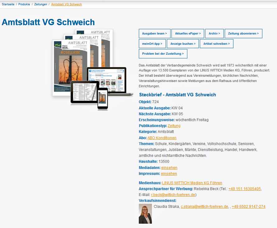 Für eine persönliche Beratung stehen Ihnen unsere Medienhäuser und Medianberater gerne zur Verfügung. Ihr zuständiges LINUS WITTICH Medienhaus finden Sie mit dem Standort-Finder und Ihre/n Medienberater über die Mediadaten einer jeden Zeitung unter Zeitung online lesen.