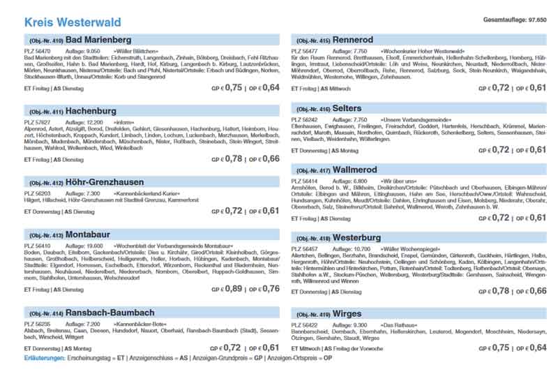 Anzeigen- und Prospektbeilagenpreise, alle Zeitungen, alle Verbreitungsgebiete und mehr