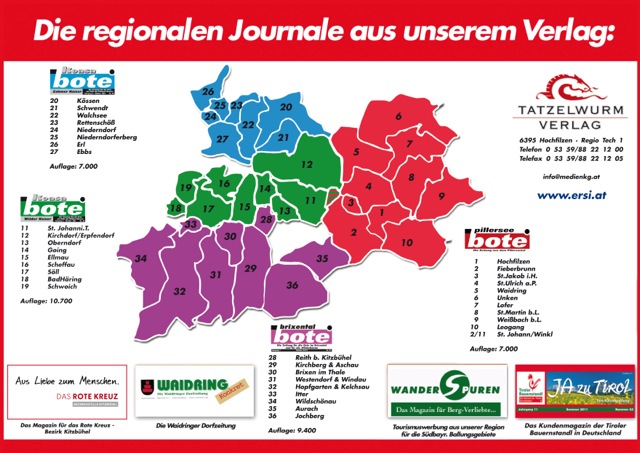 Mediadaten von unseren Zeitungen beinhalten, je Verbreitungsgebiet eines Medienhauses die publizierten Titel der Amtsblätter, Mitteilungsblätter und Anzeigenblätter, die Auflage, die jeweiligen Orte, wo diese zugestellt werden, die Preise für Geschäftsanzeigen und Beilagen je Millimeter und Druckspalte sowie nützliche technische Informationen. Die gedruckten Mediadaten erhalten Sie auf Anfrage bei unseren Medienhäusern.